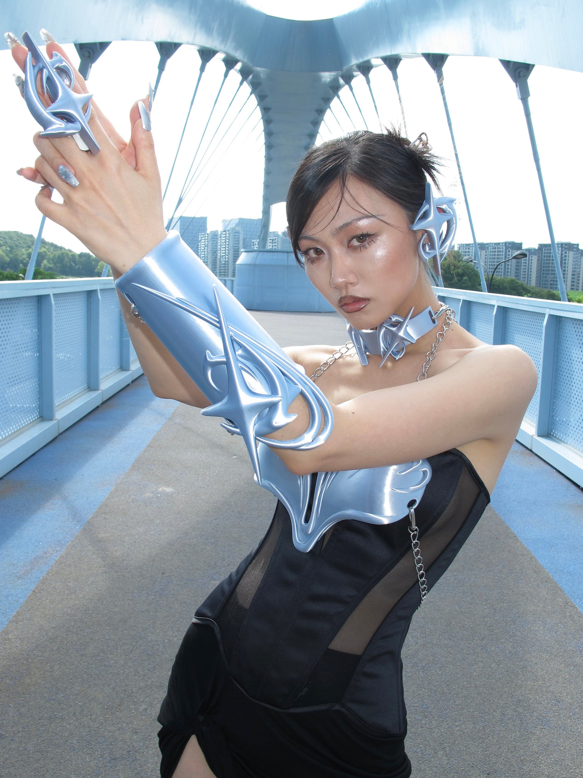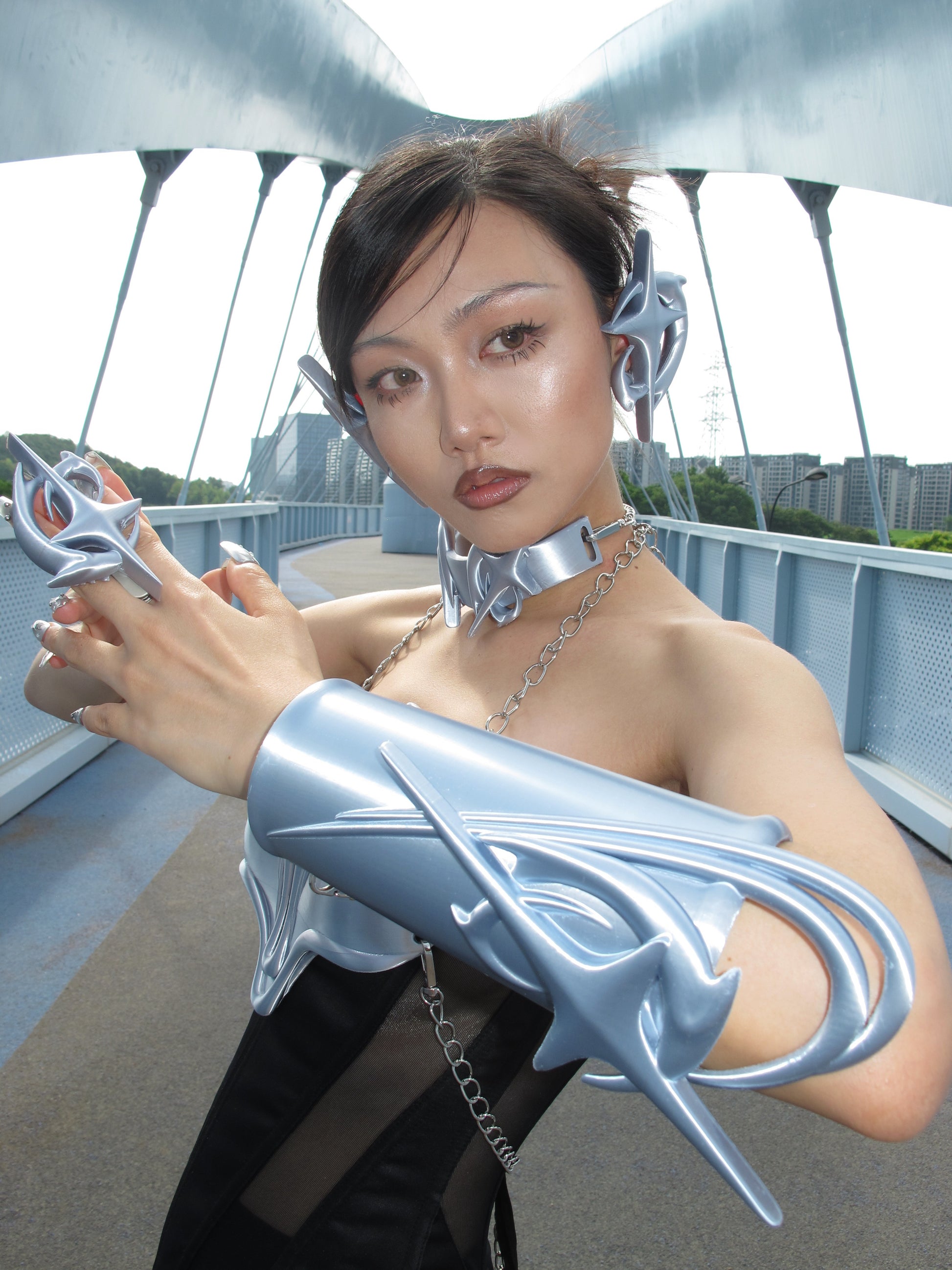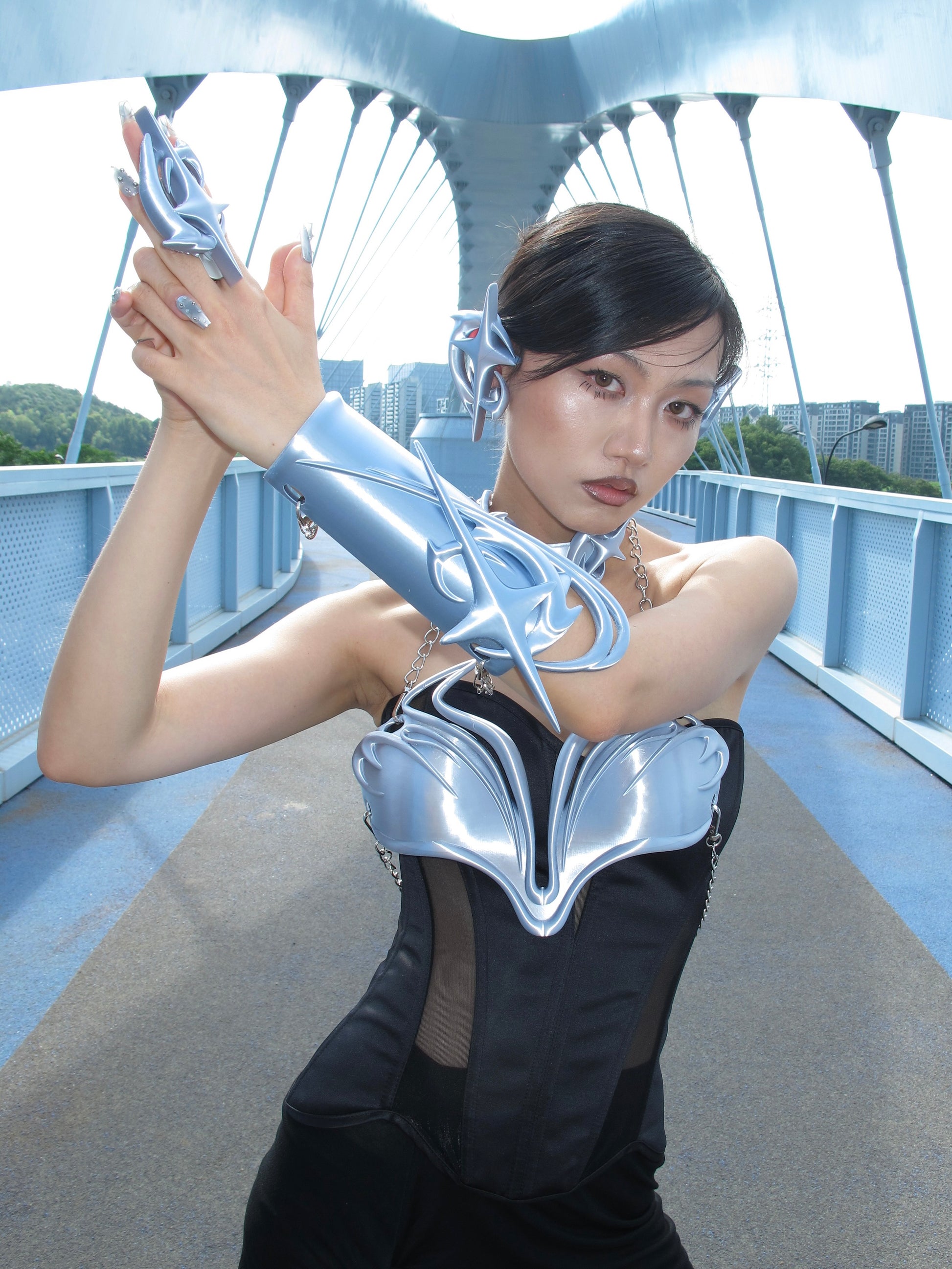 YALA.Lab | 3D printed tetrahedron futuristic tech-themed electronic Y3K girl gauntlets